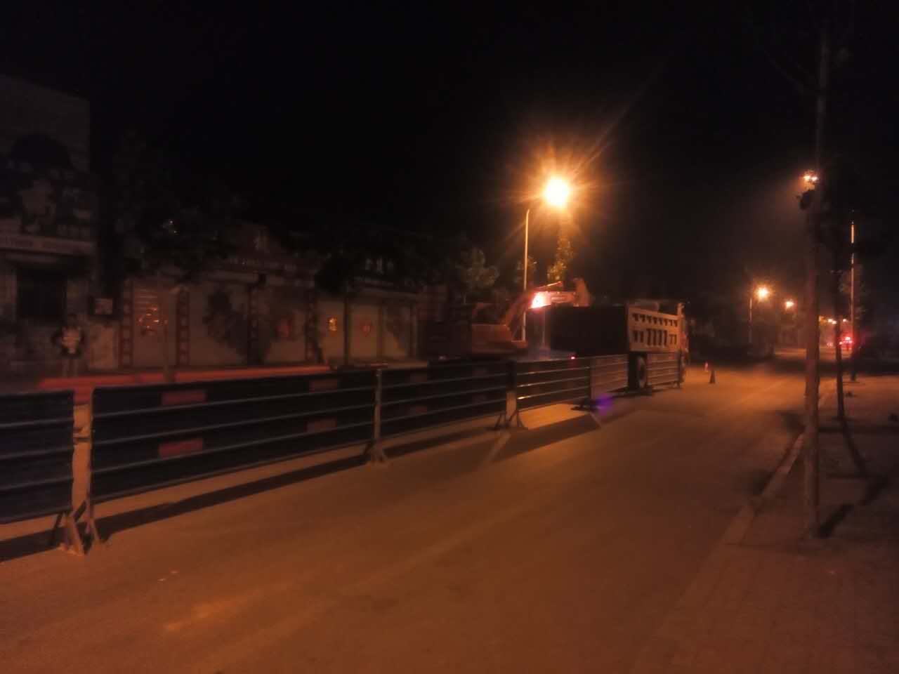 由于該工程緊靠利民批發(fā)市場、鋼材批發(fā)市場及香港街等大型物資集散地,車流、人流量大,沿線營業(yè)門市眾多,本就狹窄的道路無法提供有效的工作寬度。項(xiàng)目管理人員根據(jù)工地現(xiàn)狀,制定了白加黑的施工方案。在白天正常施工的同時,將開挖裝車、商砼澆筑等對工作寬度要求高的工序放在晚上進(jìn)行。