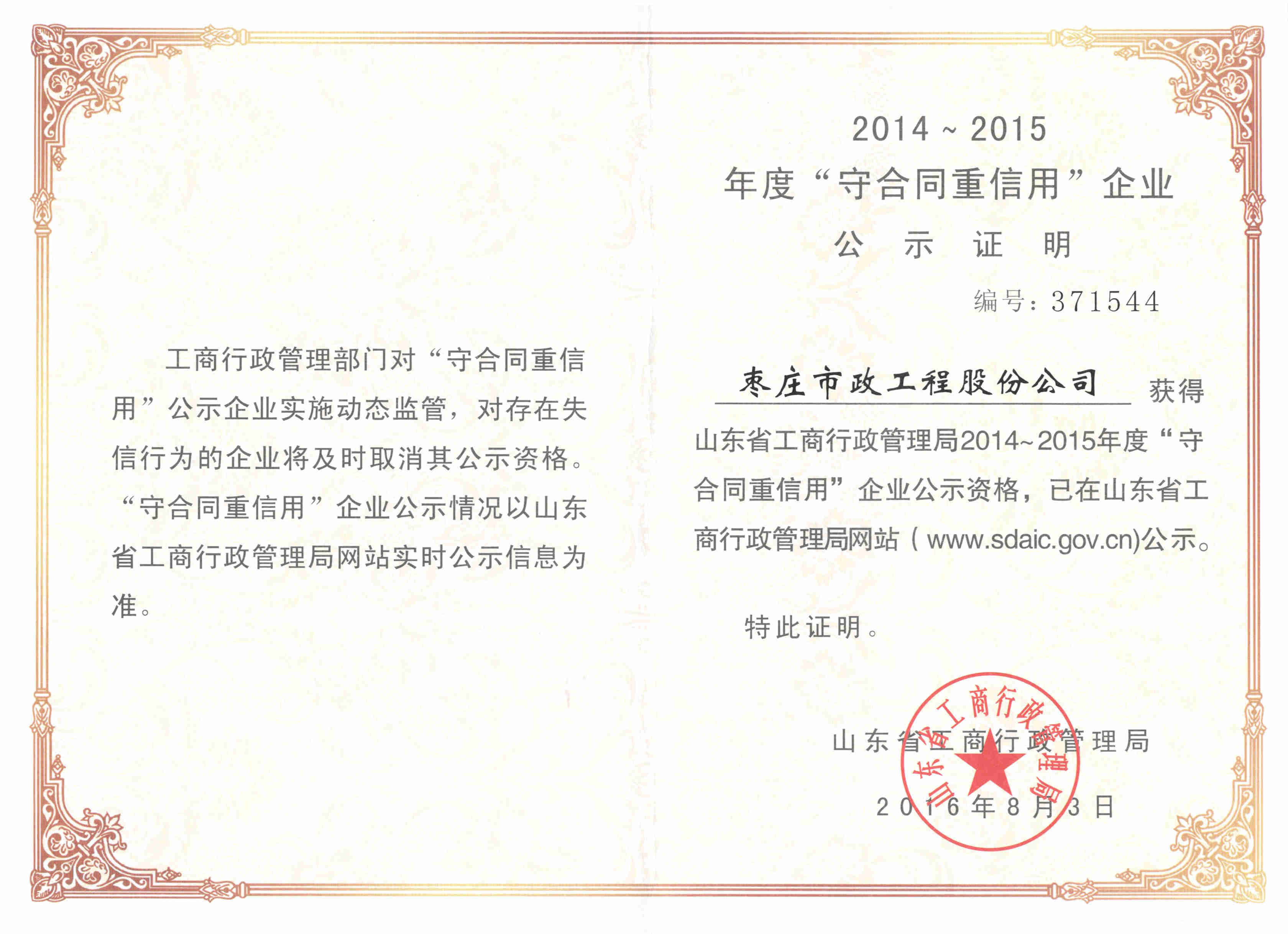 8月31日,我公司從棗莊市工商局領(lǐng)取了2016年省級“守合同、重信用企業(yè)”證書,這是公司自2010年成功晉級省級“守重企業(yè)”以來第6次獲此殊榮。