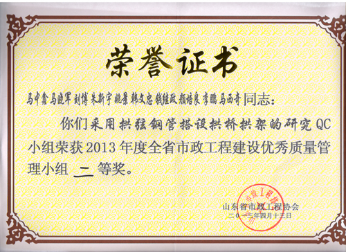 “采用拱弦鋼管搭設拱橋拱架的研究”QC小組榮獲2013年度全省市政工程建設優(yōu)秀質(zhì)量管理小組二等獎