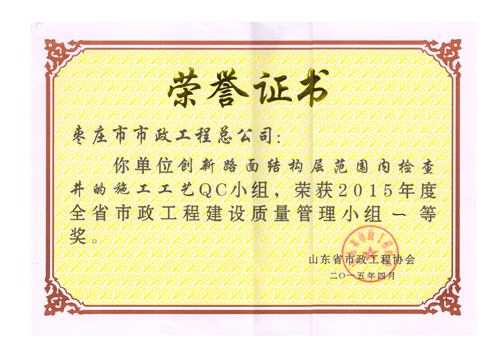 “創(chuàng)新路面結(jié)構(gòu)層范圍內(nèi)檢查井的施工工藝”QC小組榮獲2015年度全省市政工程建設(shè)質(zhì)量管理小組一等獎(jiǎng)