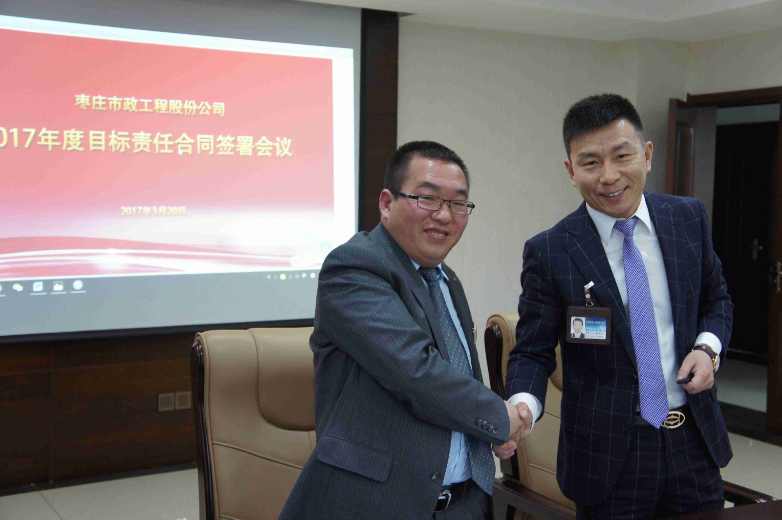 3月20日上午,棗莊市政工程股份公司召開2017年度目標責任合同簽署會議。全體高管、各部門(各分公司)主要負責人以及上?;蹣愎芾碜稍児竟ぷ魅藛T在辦公樓12樓會議室參加了會議。趙峰董事長(總經(jīng)理)代表公司同各部門(各分公司)主要負責人簽署了《2017年度目標責任合同》。會議由劉博副總經(jīng)理主持。