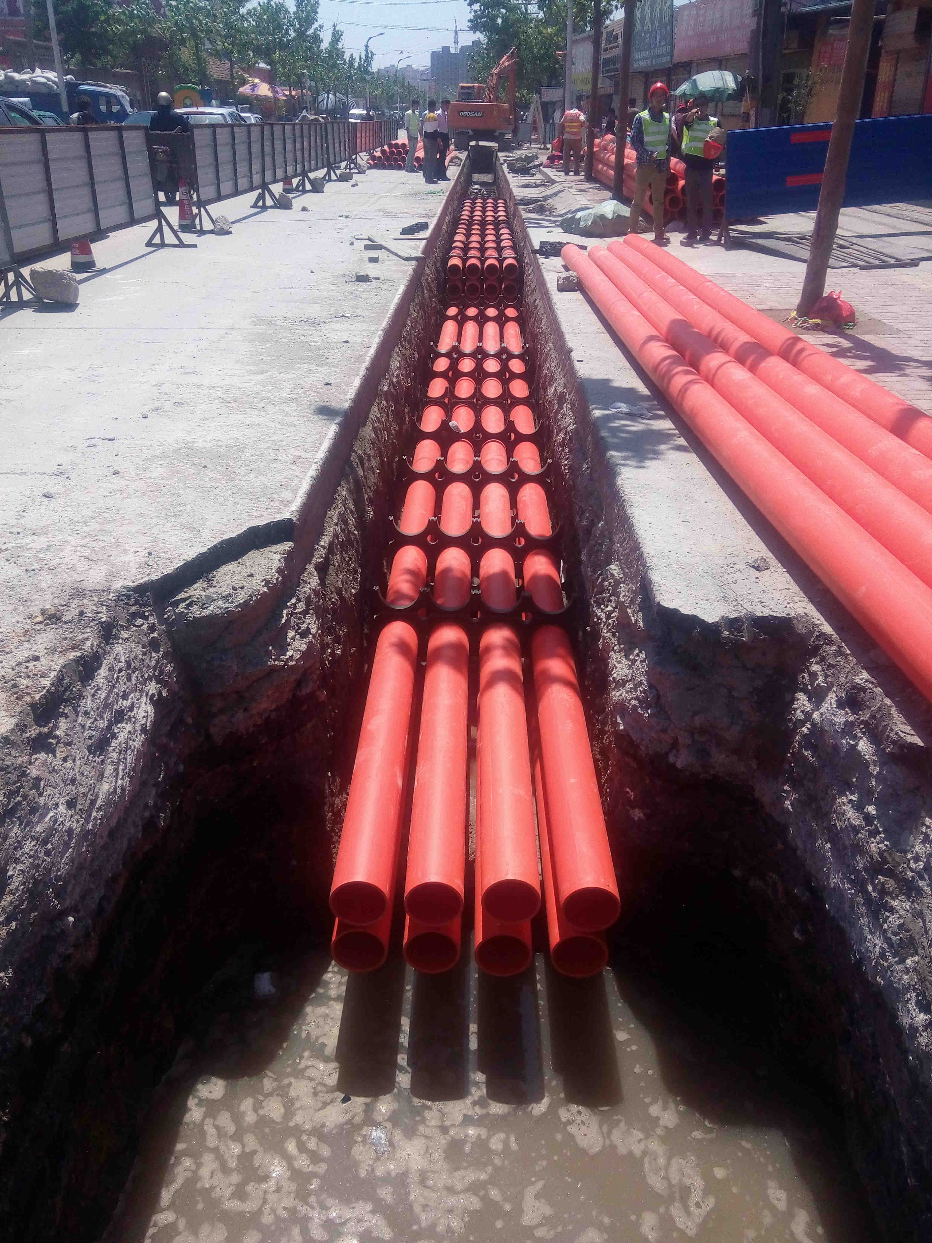 截止到目前電纜溝開挖已經(jīng)完成,開槽開挖已完成430米,管道安裝300米,包封310米,磚墻檢查井砌筑6座。目前供電排管安裝正加緊施工,火速推進(jìn)。在緊張施工的同時,項(xiàng)目部更把安全質(zhì)量放在首位,堅(jiān)強(qiáng)圍擋、警示燈安全文明施工措施,給附近居民出行保駕護(hù)航。