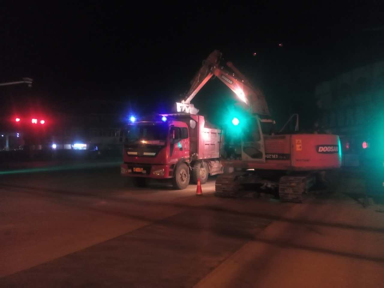 由于該工程緊靠利民批發(fā)市場、鋼材批發(fā)市場及香港街等大型物資集散地,車流、人流量大,沿線營業(yè)門市眾多,本就狹窄的道路無法提供有效的工作寬度。項(xiàng)目管理人員根據(jù)工地現(xiàn)狀,制定了白加黑的施工方案。在白天正常施工的同時,將開挖裝車、商砼澆筑等對工作寬度要求高的工序放在晚上進(jìn)行。